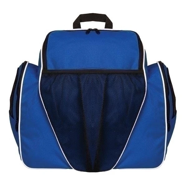 The Champion Sports All Purpose Backpack allows you to carry and organize your sports equipment and personal possessions. This large bag is made of 600 Denier Polyester and features a top loading compartment with a U-shaped opening. There are several handy compartments for your equipment including a large ventilated pocket for footwear, a front mesh pocket that holds any size ball, and a small inner pocket and key tab for holding personal possessions. The bag also features padded, adjustable back straps and a web looped carrying handle for comfortable transport.