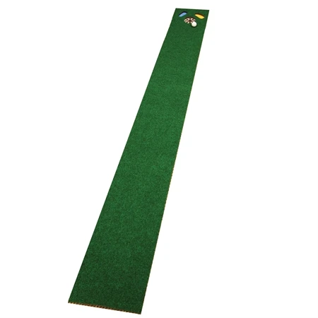 Indoors or out, these artificial-turf putting carpets offer the feel of a well-kept green. Polypropylene grass like surface simulates Bermuda grass for the authentic feel of speed, line and slop. No-slip backing keeps them flat and planted firmly on the floor. Putting cup is 1/4″ smaller than regulation size to sharpen aim. Lake and sandtrap cutouts catch missed shots. Slight incline develops firmness of stroke. Rolls up for easy storage. Measures 18″W x 9’L.