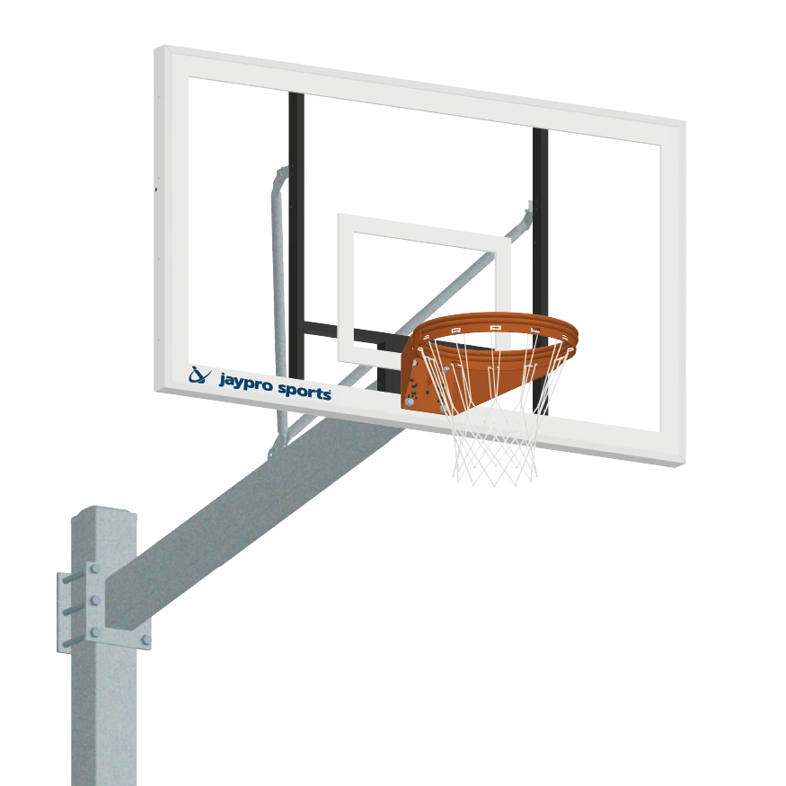 Heavy-duty fixed height system with backboard and goal mounted directly to extension arm for exceptional strength. Reinforced with rear support braces!