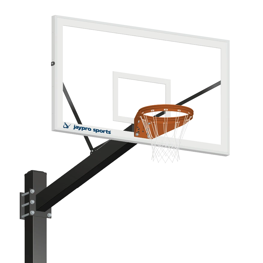 Heavy-duty fixed height system with backboard and goal mounted directly to extension arm for exceptional strength. Reinforced with rear support braces!