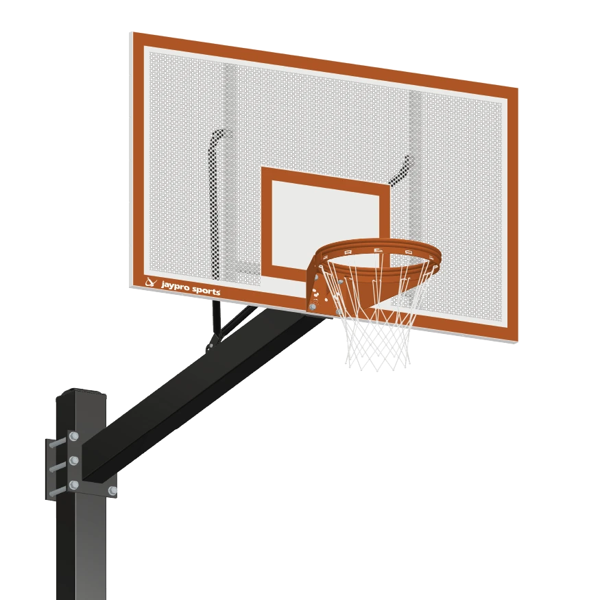 Heavy-duty fixed height system with backboard and goal mounted directly to extension arm for exceptional strength. Reinforced with rear support braces!
