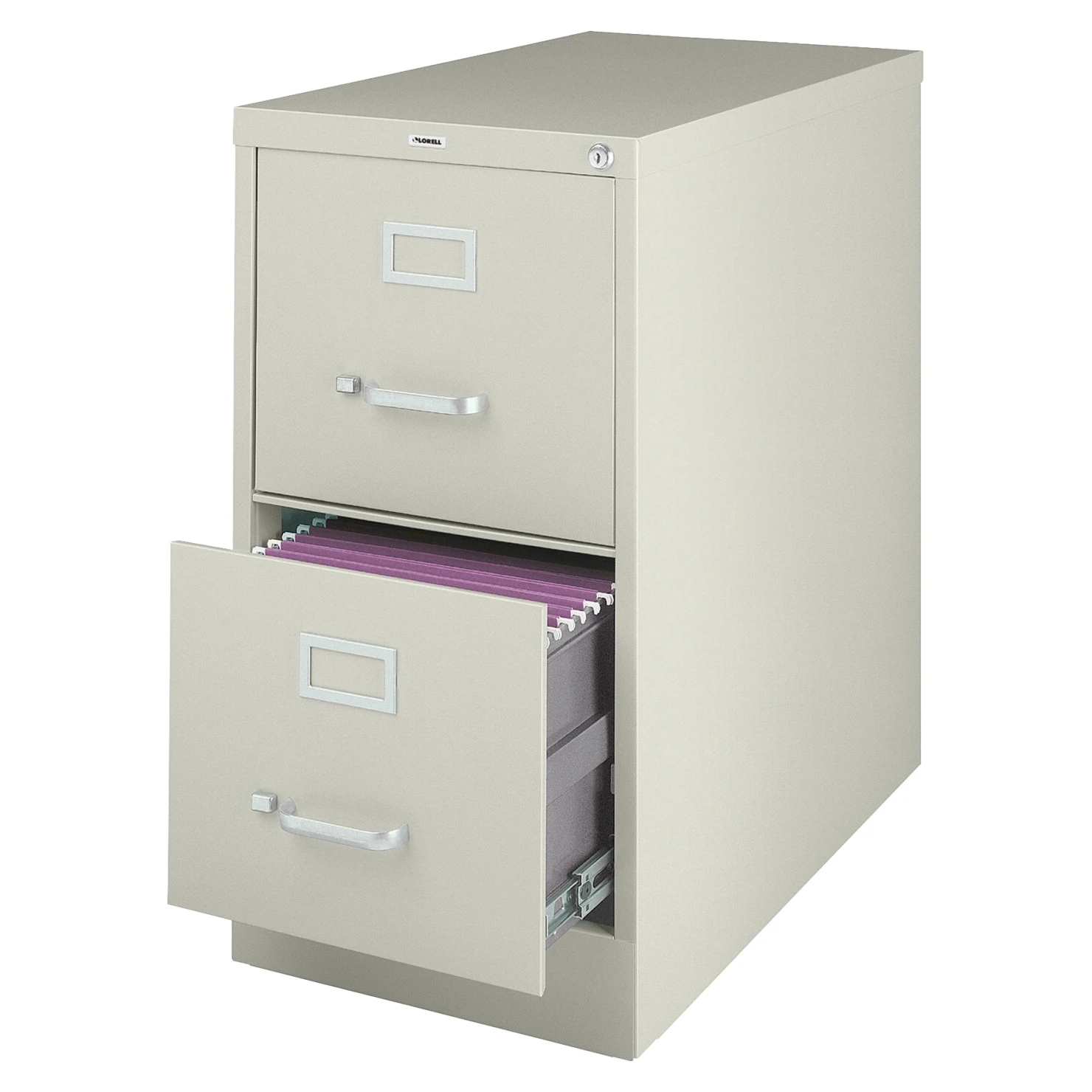 Lorell Fortress Series Vertical File with lock features a heavy-gauge steel construction with recycled content and contains steel ball-bearing slide suspension for smooth operation. File contains two high-sided drawers that accommodate letter-size hanging file folders and the fully loaded drawers open easily. File comes with an aluminum label holder for easy referencing and a convenient pull handle on each drawer. The adjustable wire followers keep the files upright and the core-removable lock enables one-key convenience for multiple files. 15 in x 25 in x 28-3/8 in. Putty.