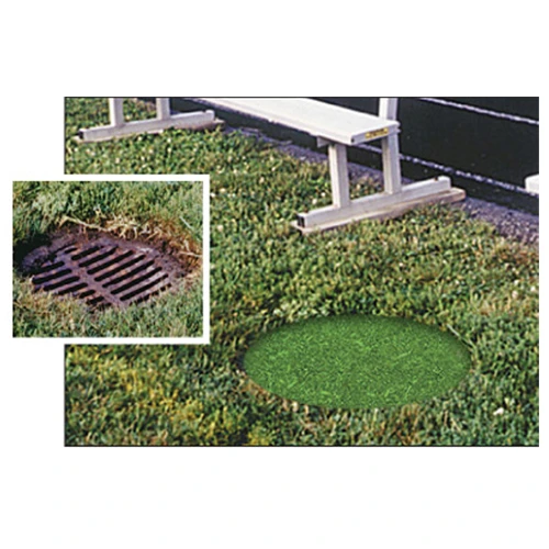 Cover your hazardous drainage grates and utility boxes with non-skid, recycled rubber covers. Water flows through. Diminishes the risk of injuries to players and spectators. Approximately 3/4″ thick. Color: Dark Green.