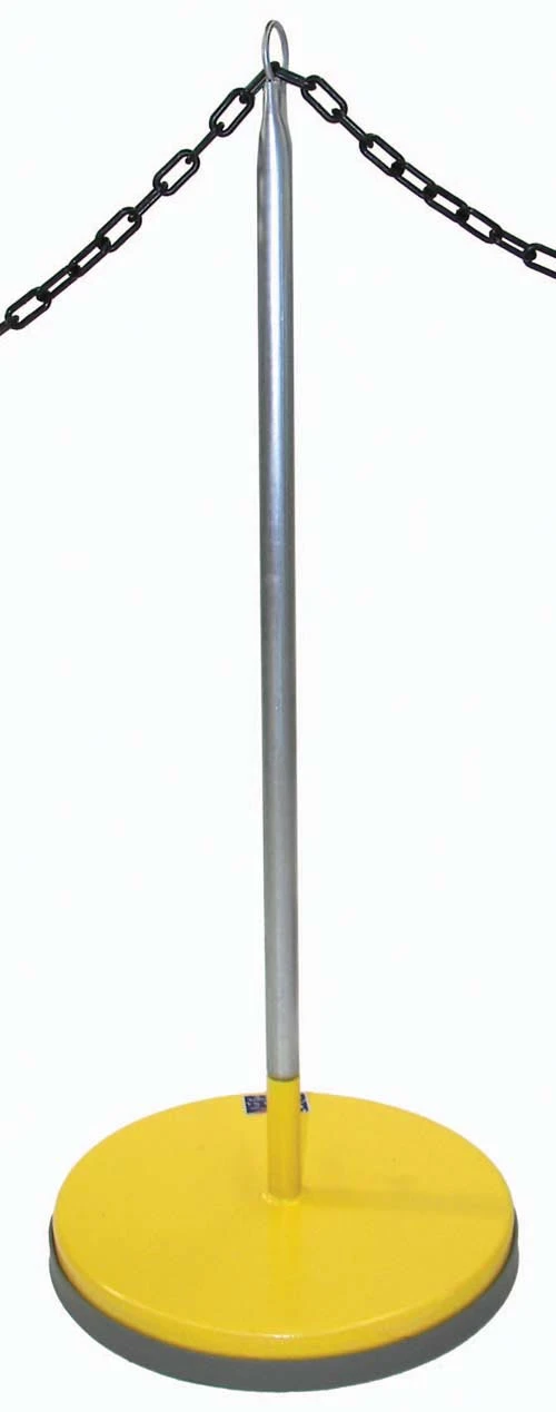 Constructed with lightweight (7 lbs) but stable 14″ diameter flat top safety base, 12 gauge steel with rounded edges. Upright is 36″ high x 1″ diameter, made of 16 gauge galvanized steel tube with permanently attached 3/16″ steel ring. Unit suitable for pennant streamers, plastic chain or rope. Available in red or yellow.