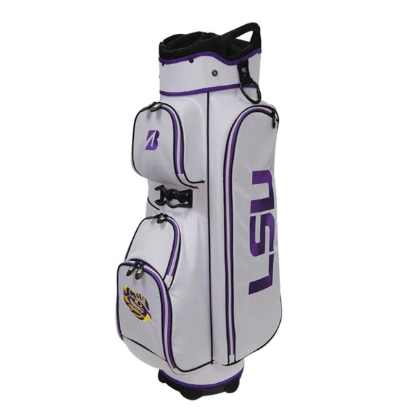 The Bridgestone NCAA Cart Bag features 7-way divider top with a top lift handle. The cart bag has 6 zippered pockets including a cooler pocket and an outer golf ball holder. Also included with the cart bag is a rain hood to help keep your clubs dry during rainy days.